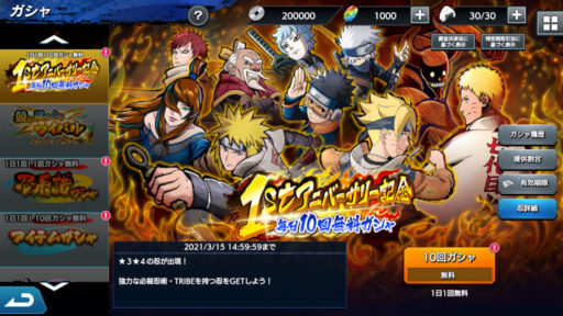 忍トラ史上初、10回無料ガシャ。毎日回そう。