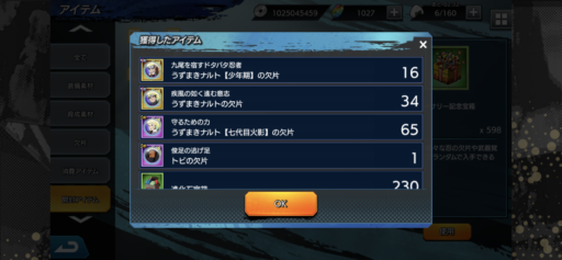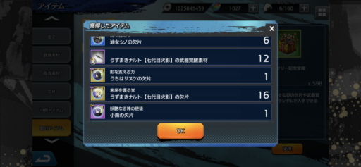 URナルトの欠片:34(前日比:+23個、累計:591個、1日あたり平均:22.73個)少年ナルトの欠片:16(前日比:-11個、累計:604個、1日あたり平均:23.23個)UR七代目ナルトの欠片:16(前日比:-15個、累計:588個、1日あたり平均:22.62個)