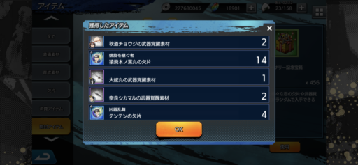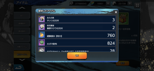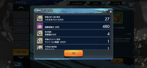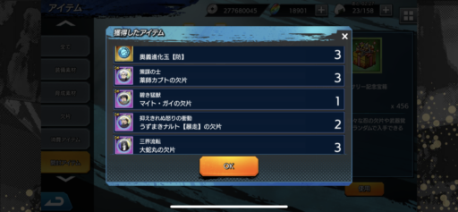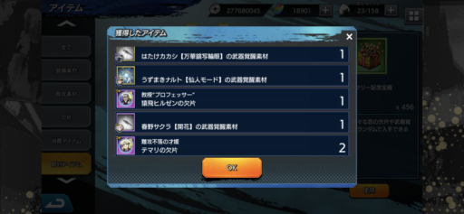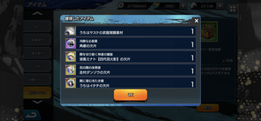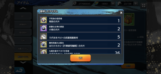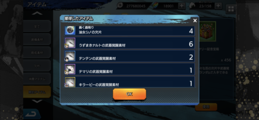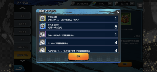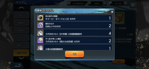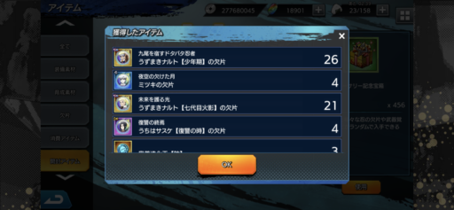 URナルトの欠片:27(前日比:-6個、累計:237個、1日あたり平均:26.33個)少年ナルトの欠片:26(前日比:+2個、累計:222個、1日あたり平均:24.67個)UR七代目ナルトの欠片:21(前日比:-8個、累計:189個、1日あたり平均:21.0個)