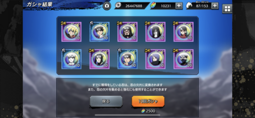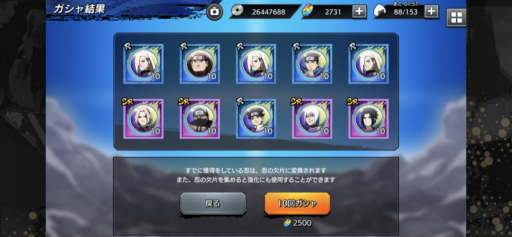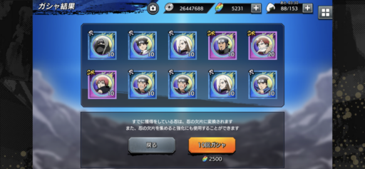 50連でUR1体。ハズレではないが、当たりでもないガシャだなあ。