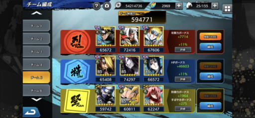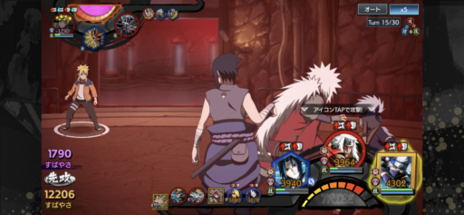 3順目でミナト自来也ナルトTRIBEを撃ったときに、ワンパンで倒せるよう防属性を中心に削っておく。アタッカーのビーも忘れず削る。
